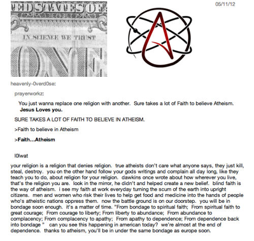 So i have a tumblr...and I follow atheists on there...along with all the funny little gifs that help me procrastinate throughout the day...but I found this one person who posts this. This person "prays" for all the atheist posts on tumblr which is kind of funny. But here is one post that I thought was quite interesting.