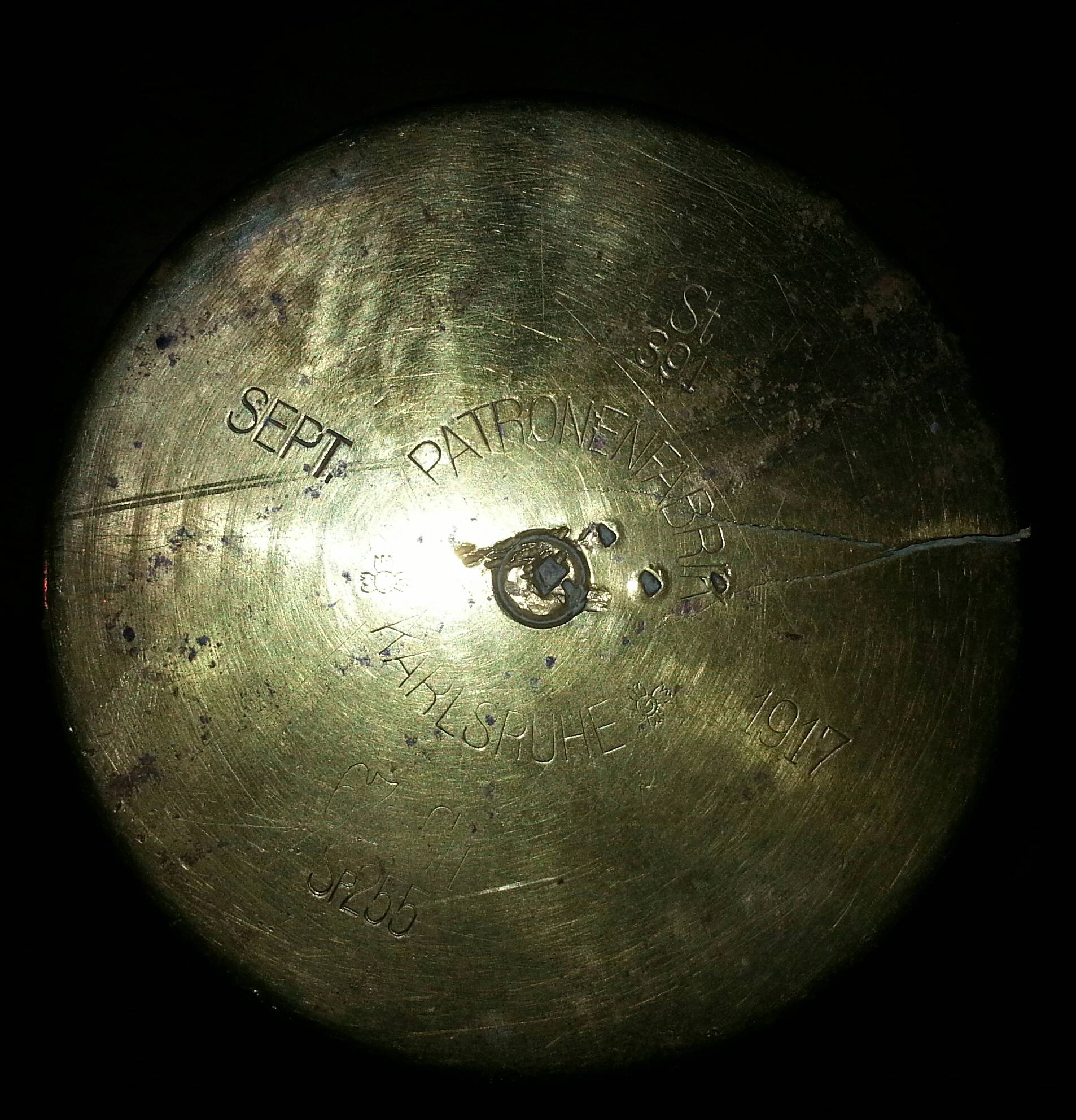 So back to the item in question. This is an Imperial German 77mm field artillery casing manufactured in 1917 by Patronenfabrik Karlsruhe. You can see the firing marks on the bottom, and it has a crack that runs up along the sides which I'm not sure is from the initial firing or simply from age.