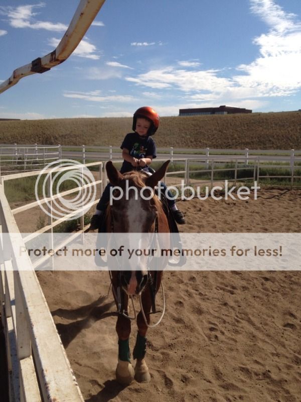 Husband's aunt owns a horse.  I think its name is Cinnamon.  Anyway, that's T, on Cinnamon, wearing his bike helmet.  :D