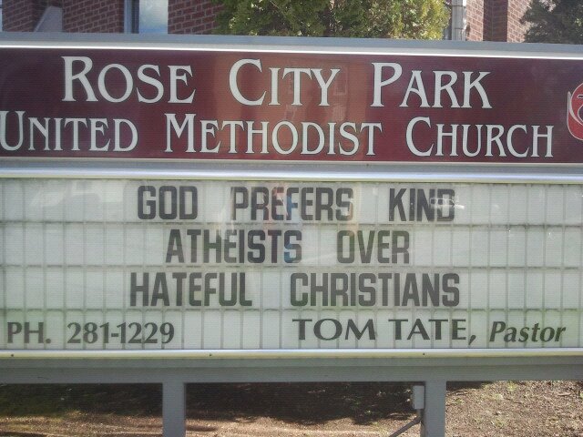 The sign may or may not be photoshopped, but Tom Tate is/was in fact the pastor at Rose City Park United Methodist Church. PDF link: http://www.rcpumc.org/newsletters/06.22.2011.pdf